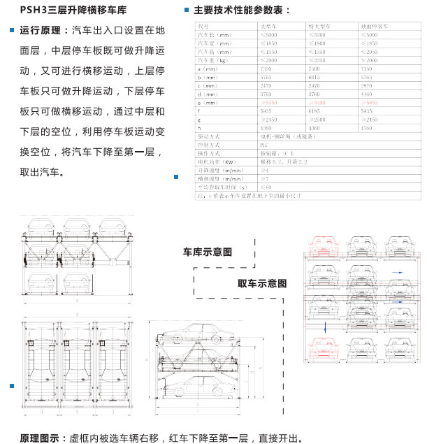 運行原理:汽車出入口設置在地面層,中層停車板既可做升降運動,又可進行橫移運動,上層停車板只可做升降運動,下層停車板只可做橫移運動,通過中層和下層的空位,利用停車板運動變換空位,將汽車下降至第一層,取出汽車。