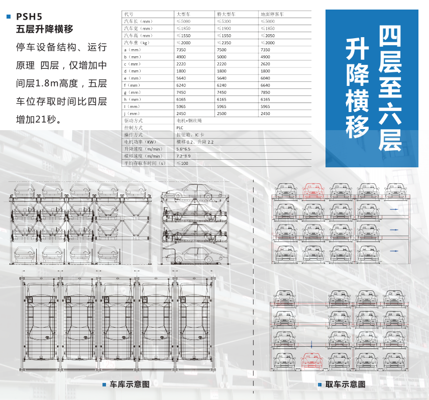 運行原理:汽車出入口在地面層,最高層的停車板只做升降運動,最低層只做橫移運動,中間兩層既可做升降又可做橫移運動。下三層均設有空位,停車板通過橫移變換空位,降下空位上方的汽車,最低層汽車無需運動即可取出。