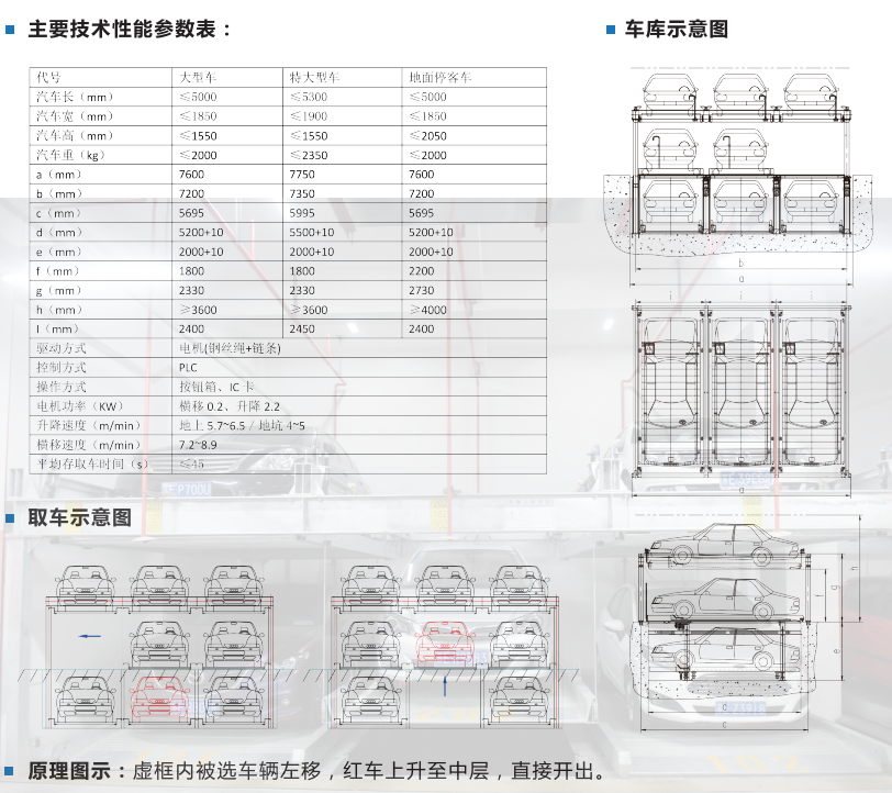 運行原理:上層和地坑層停車板做升降運動,地面層設有一個空位,地面層停車板做橫移運動變換空位,上層和地坑層停車板通過空位升降至地面(中層)取車(存車),地面層停放汽車可直接開出。