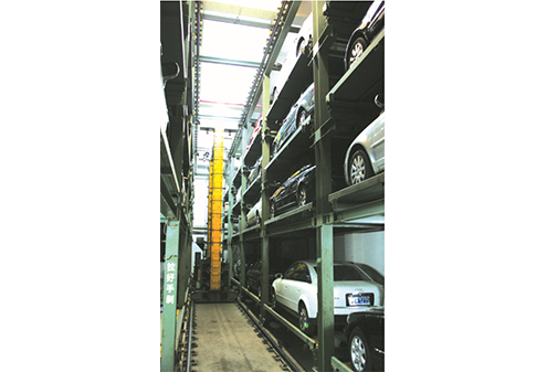 在兩側泊位的中央設有巷道堆垛機,整個車庫的運行均由堆垛機來完成。汽車入庫時,汽車停在入庫臺上,堆垛機從出入庫臺上取走汽車后在巷道內行走并提升,將汽車運送到指定層的泊位旁,堆垛機上的存取機構將汽車從堆垛機送入泊位;取車出庫過程與入庫過程相反。